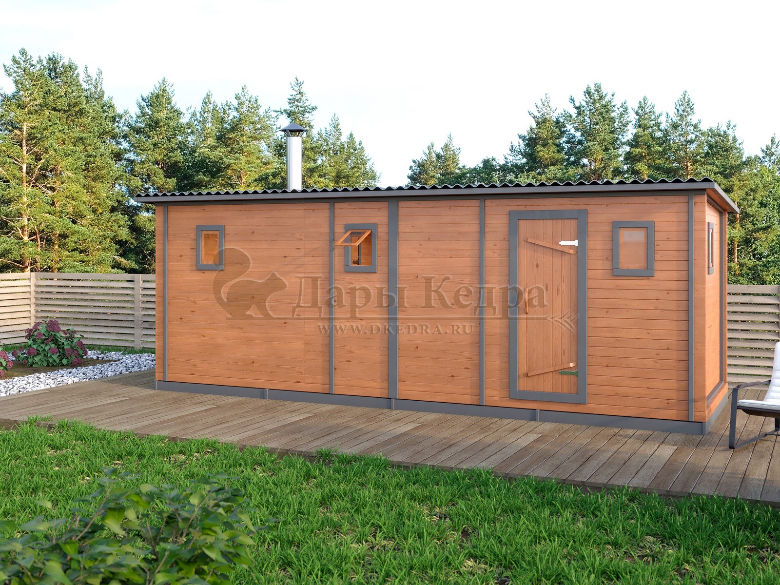 Это классическая прямоугольная модель бани с тремя отделениями: предбанником, моечной и парилкой. Для удобства пользования предбанник оснащен лавочкой и вешалкой. В моечной находится лавка и полочка из кедра. Парилка оборудована двухуровневым открытым полком и печью. Время растопки такой бани не превышает 30 минут. Каркасно-щитовую баню можно заказать как в готовом, так и в разборном варианте. В разборной модели готовые щиты из кедра быстро собираются в полноценное строение, что также позволяет исключить лишний строительный мусор. Такая баня не требует полноценный фундамент, поэтому при необходимости ее можно перенести в другое место.