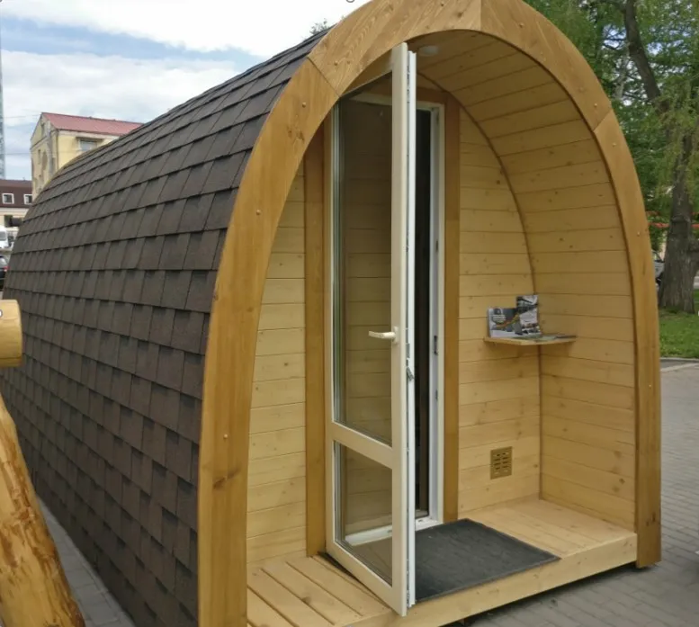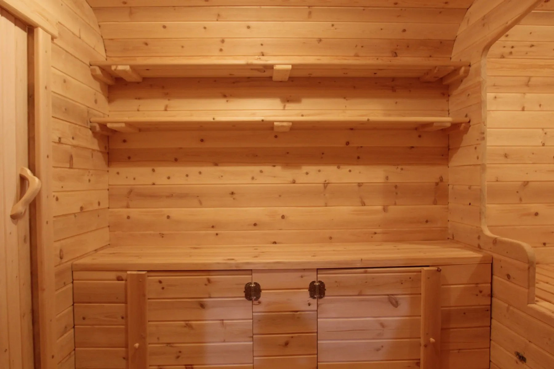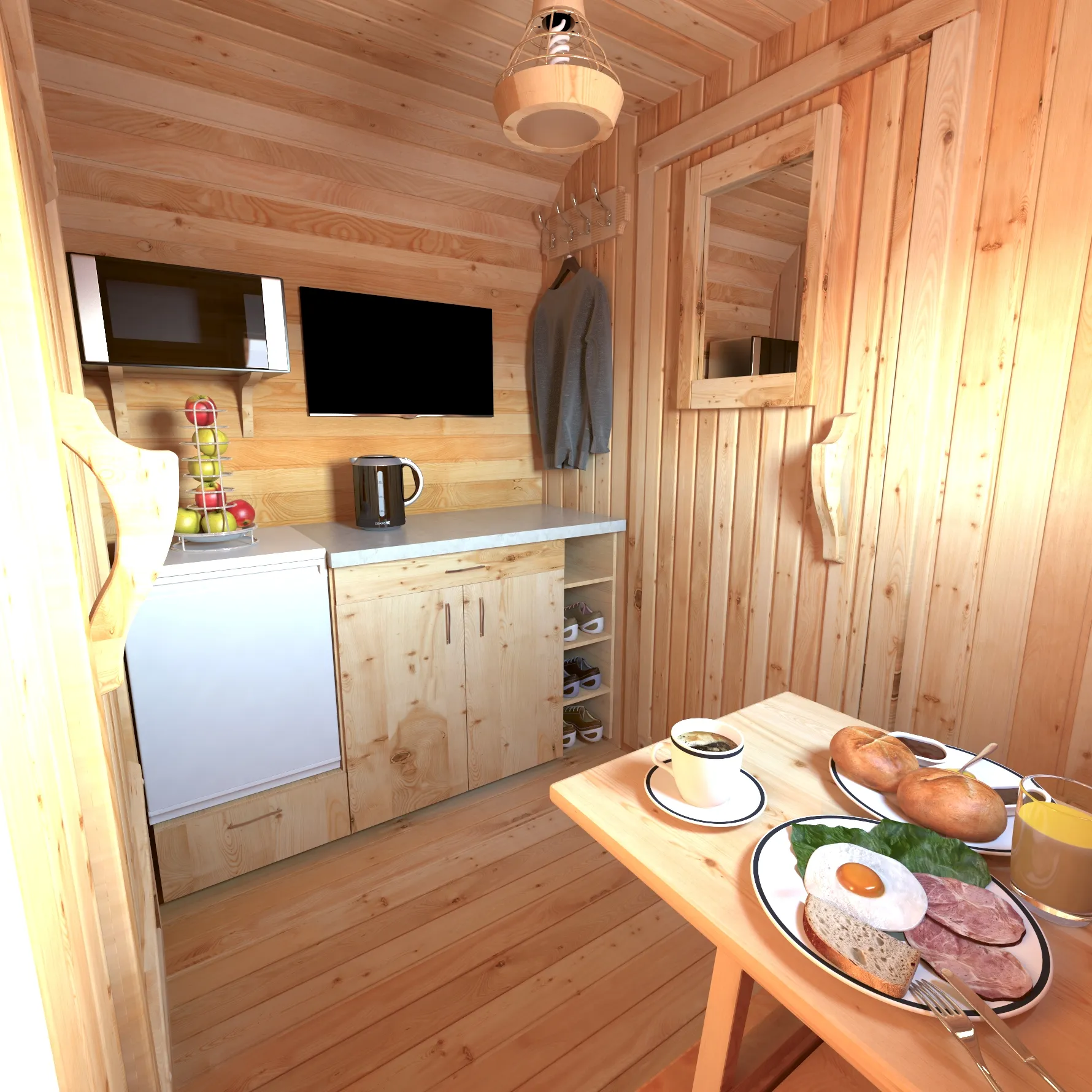 Домик с тремя помещениями подходит для дачного использования в теплое время года или обустройства загородных баз отдыха. Прихожая и кухня занимают одну комнату, в которой стоит стол из кедра. Две другие оборудованы четырьмя деревянными лежаками, по желанию их можно заменить на двуспальные кровати. Либо обустроить санузлом и душевой зоной. Для удобства пользования кемпинг дом можно укомплектовать верандой с лавочками или козырьком.